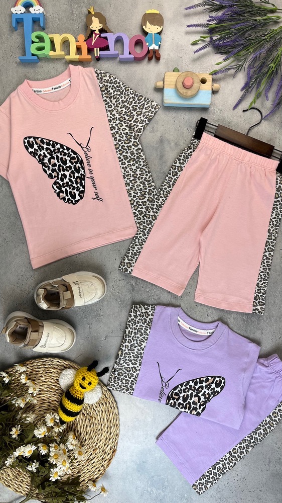 تیشرت شلوارک دخترانه راحتی طرح پروانه مناسب ۲ الی ۹ سال